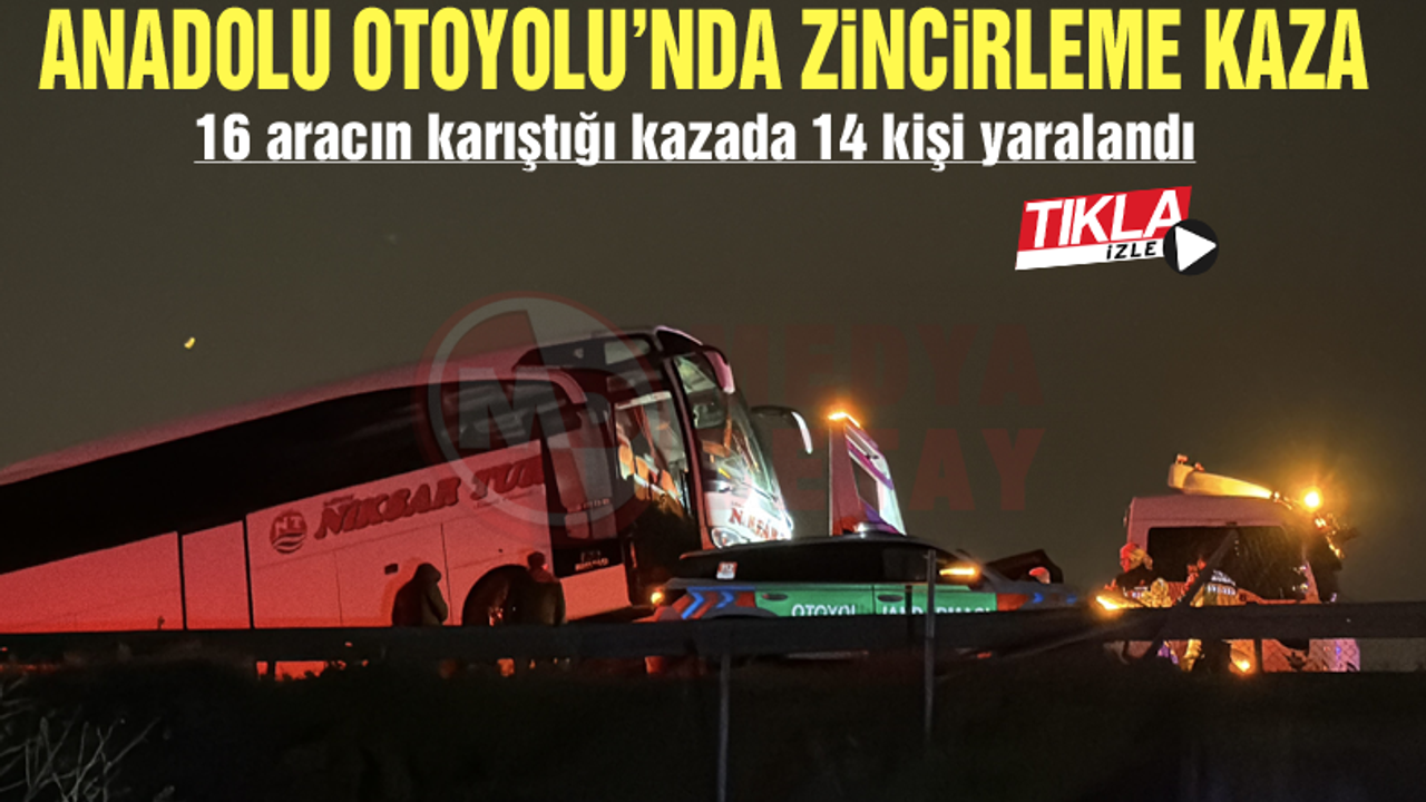 Kaza, Sakarya'nın Arifiye ilçesi Türkçaybaşı Mahallesi Anadolu Otoyolu Akyazı mevkiinde meydana geldi. Edinilen bilgilere göre aralarında tır, yolcu otobüsü ve otomobillerinde bulunduğu toplam 16 araç kazaya karıştı. İlk bilgilere göre kazada toplam 14 kişi yaralandı. Durumun ihbar edilmesi üzerine olay yerine çok sayıda sağlık, polis ve itfaiye ekibi sevk edildi. Yaralılar olay yerindeki ilk müdahalenin ardından çevre hastanelere sevk edilirken, kaza nedeniyle yolda uzun araç kuyrukları oluştu. Olay yerindeki çalışmalar sürüyor.