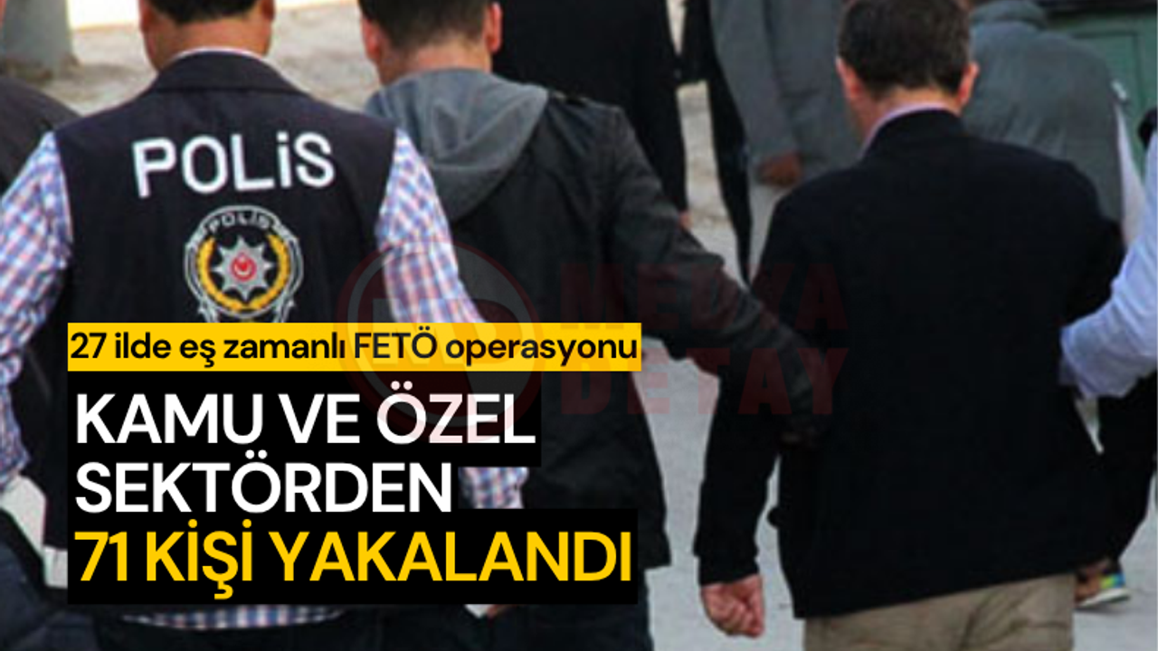 İçişleri Bakanı Yerlikaya, sosyal medya hesabından yaptığı paylaşımda İstanbul merkezli olmak üzere Adana, Aksaray, Ankara, Antalya, Balıkesir, Batman, Bolu, Çanakkale, Gaziantep, İzmir, Kayseri, Kocaeli, Konya, Kırıkkale, Kırşehir, Manisa, Malatya, Muş, Sakarya, Sivas, Tekirdağ, Amasya, Aydın Bursa, Mersin ve Zonguldak'ta FETÖ'ye yönelik düzenlenen operasyonlarda kamu görevlisi ve özel sektör çalışanı 71 şüpheliyi yakaladıklarını belirtti.