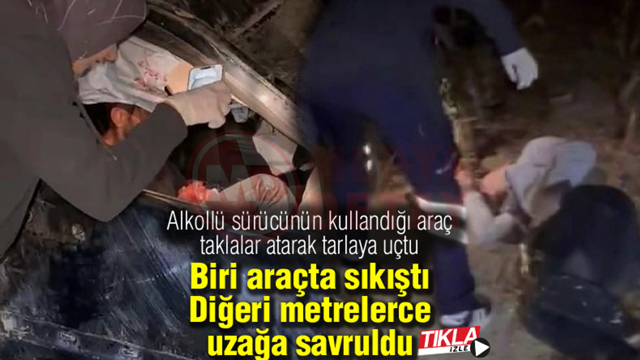 Araçta bulunan iki kişiden biri sıkışırken, diğerinin ise metrelerce uzağa savruldu.