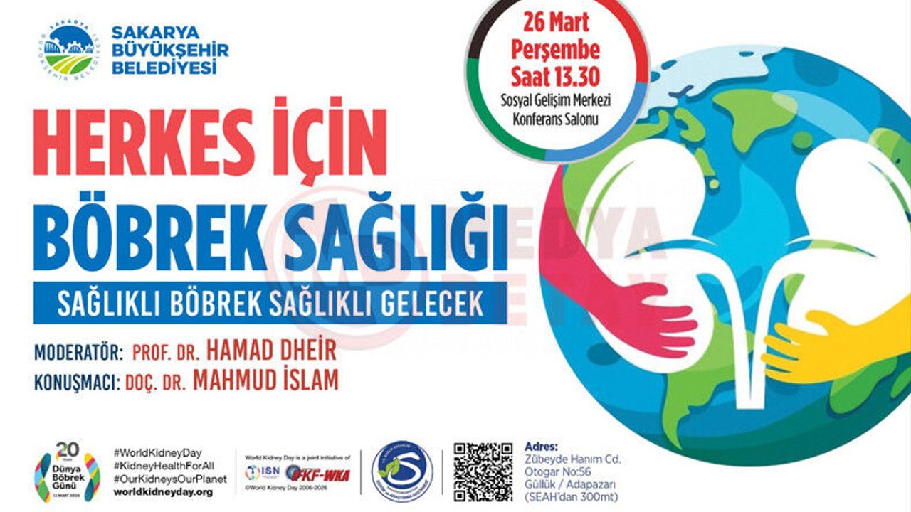 Sakarya Üniversitesi ve Sakarya Eğitim ve Araştırma Hastanesi Nefroloji Bilim Dalı iş birliğiyle düzenlenecek program, 26 Mart Perşembe günü saat 13.30’da Sosyal Gelişim Merkezi Konferans Salonu’nda gerçekleştirilecek.