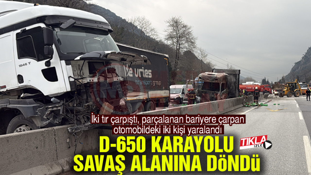 D-650 karayolu Sakarya geçişi Bilecik istikametinde meydana gelen kazada, M.Ç. (45) yönetimindeki 42 HC 623 plakalı çamaşır suyu yüklü tır ile L.A. idaresindeki 10 AUP 020 plakalı tır çarpıştı. Çarpışmanın ardından 42 HC 623 plakalı tır refüje çarparak alev alırken, karşı yönde seyreden M.A.B. idaresindeki 64 HF 140 plakalı otomobil kaza sebebiyle yola saçılan beton molozlara çarptı. Kazada, otomobil sürücüsü M.A.B. ve eşi H.B. yaralandı. Olay yerine gelen ekipler, tırda çıkan yangını kısa sürede kontrol altına alarak söndürdü. Yaralı çift ise olay yerinde yapılan ilk müdahalenin ardından hastaneye kaldırıldı.