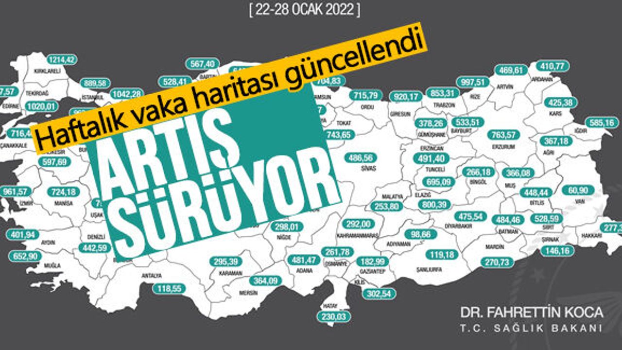 Konu ile ilgili değerlendirmelerde bulunan Bakan Koca, "22-28 Ocak arasında, 100.000 kişi içinde bir haftalık toplam yeni Covid-19 vaka sayısı il bazında neydi? Bilgiler, haftalık İnsidans haritasında." ifadelerini kullandı.