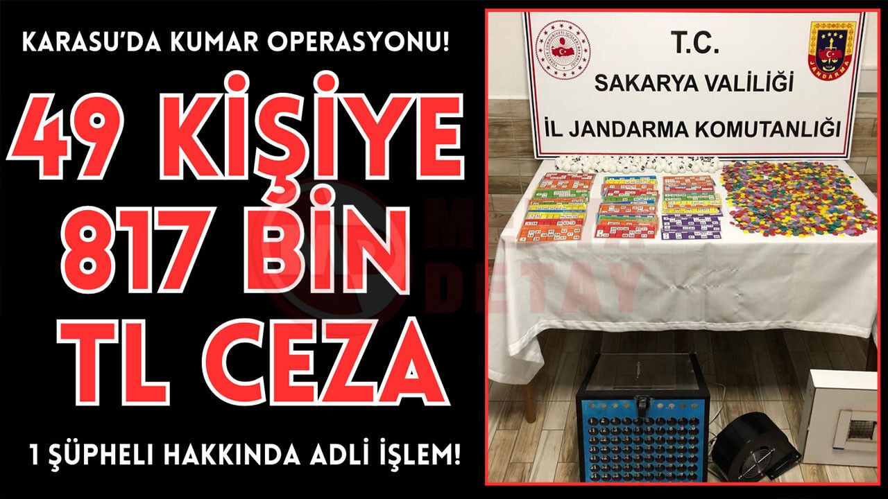 Sakarya İl Jandarma Komutanlığı ekiplerince yürütülen istihbari çalışmalar sonucunda Karasu ilçesinde bir şahsın ikametinde kumar oynatıldığı tespit edildi. Elde edilen bilgiler doğrultusunda düzenlenen operasyonda adrese baskın yapıldı. Operasyon kapsamında yapılan aramalarda; renkli kumar pulları, 104 adet tombala kâğıdı, 90 adet tombala topu, 1 adet tombala oynatma masası ele geçirilerek muhafaza altına alındı.
