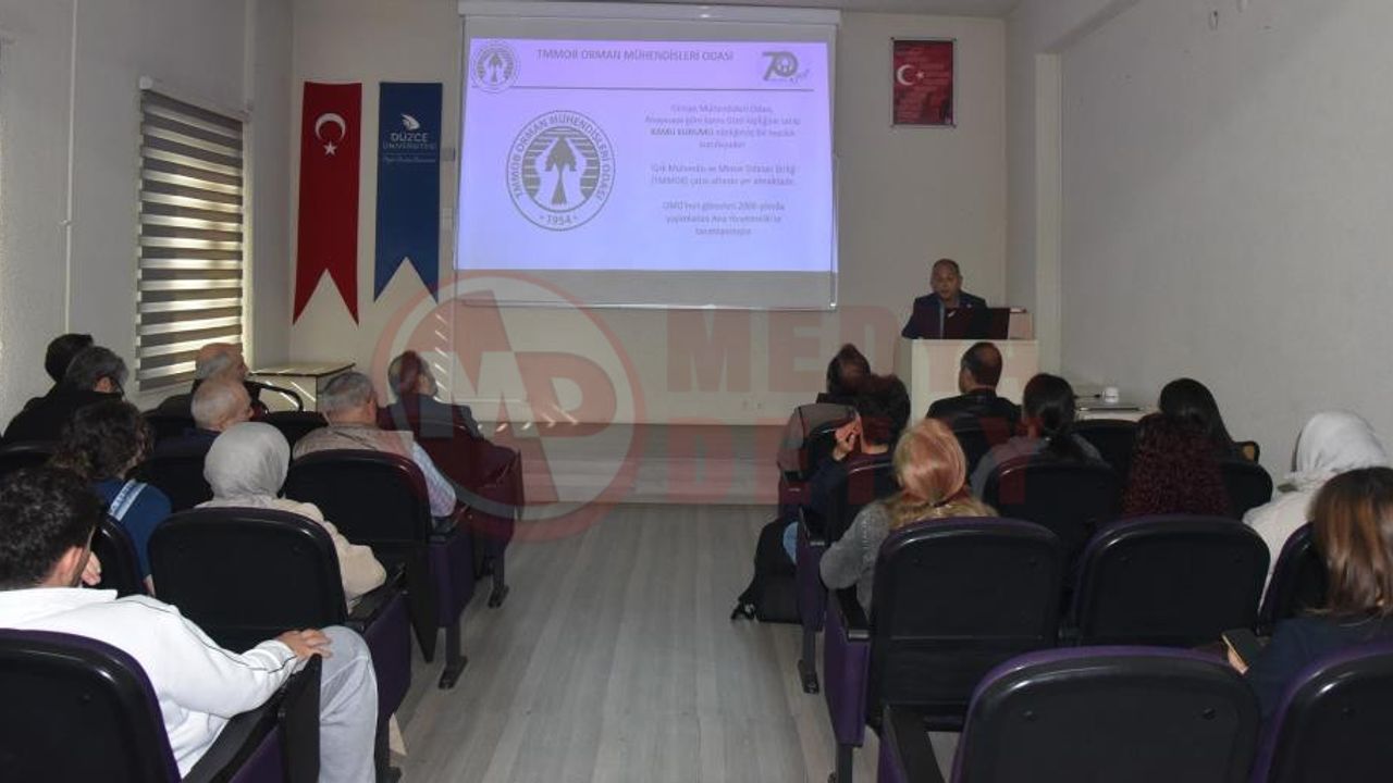 Orman Fakültesi Konferans Salonu’nda etkinliğe; Orman Fakültesi Dekan Yardımcıları Prof. Dr. Yılmaz Türk ve Doç. Dr. Halil İbrahim Şahin, akademisyenler ve öğrenciler katılım sağlarken; Orman Mühendisleri Odası (OMO) Sakarya Şube Başkanı Vedat Dilaver konuşmacı olarak etkinlikte yer aldı. Dilaver, odanın 1954 yılında Ankara’da kurulduğunu, orman mühendisi, orman endüstri mühendisi ve ağaç işleri endüstri mühendisi unvanına sahip meslek mensuplarını temsil ettiğini ifade etti. Vedat Dilaver, öğrencilerin meslekle erken bağ kurmalarının önemine vurgu yaparak odaya üye olmalarını tavsiye etti.