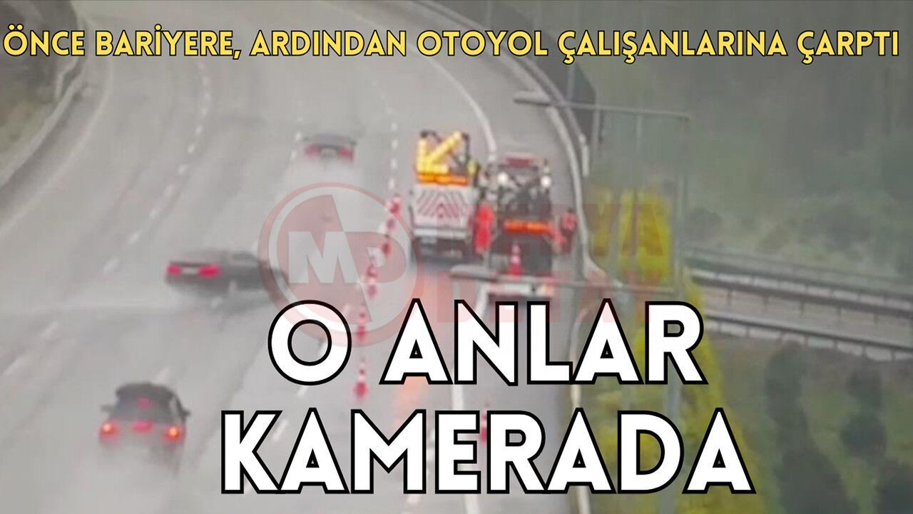 Öte yandan kaza anı güvenlik kamerası tarafından saniye saniye kaydedildi. Görüntülerde, en sol şeritte ilerleyen otomobilin birden kontrolden çıkarak şeritleri enine geçmesi, sağdaki çelik bariyerlere vurduktan sonra savrularak yol kenarında güvenlik önlemi alan çalışanlara çarpması yer alıyor.