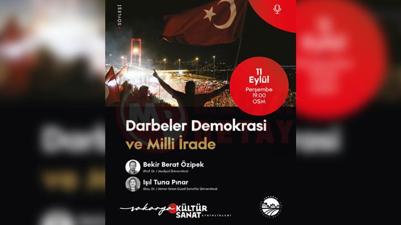 Sakarya Büyükşehir Belediyesi Kültür Sanat Etkinlikleri 11 Eylül Perşembe günü gerçekleştirilecek ‘Darbeler Demokrasi ve Milli İrade’ başlıklı söyleşi programı ile devam edecek.