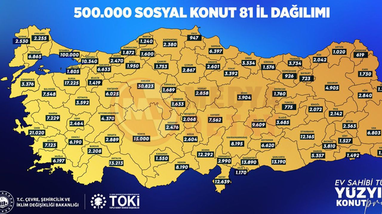Çevre, Şehircilik ve İklim Değişikliği Bakan Murat Kurum, sosyal medya hesabından, 81 ilde yapılacak sosyal konutların sayısını açıkladı.