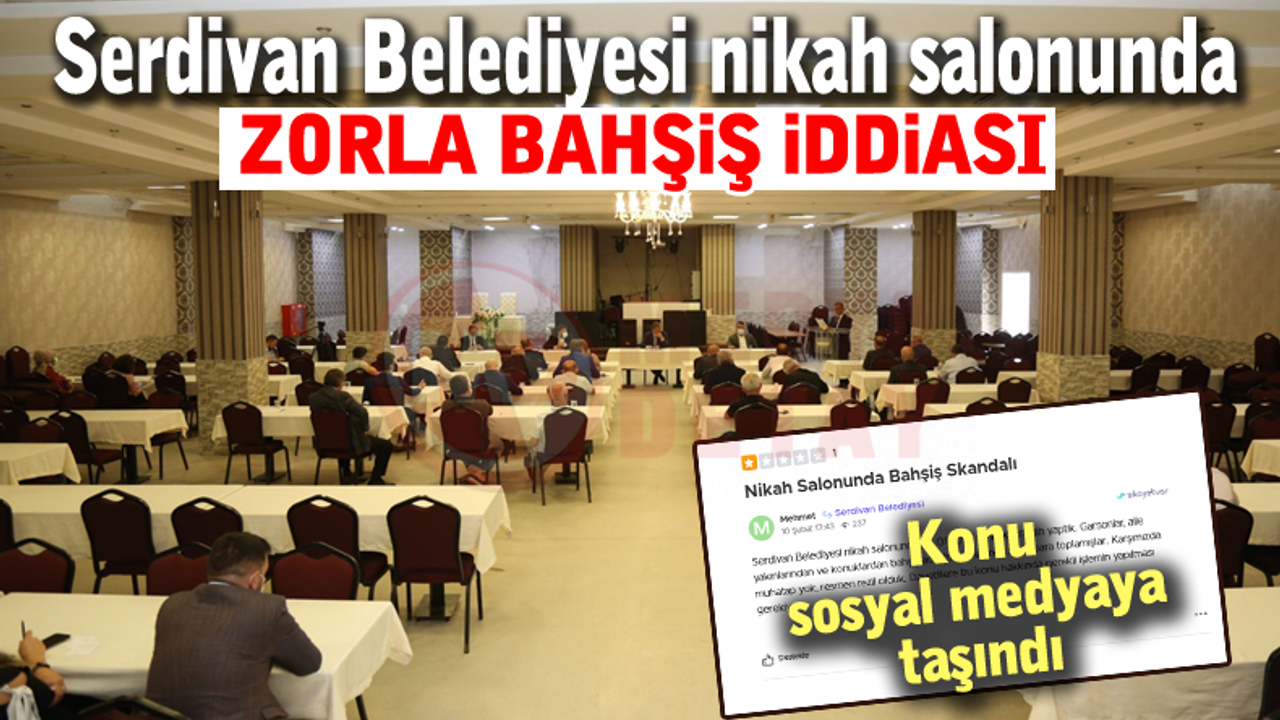 Serdivan Belediyesi’ne ait nikah salonunda bir çiftin nikah merasimi esnasında, garsonların aile yakınları ve konuklardan bahşiş adı altında zorla para topladığı öne sürüldü. Olayın ardından karşılarında herhangi bir muhatap bulamadıklarını iddia eden vatandaş da olayı sosyal medyaya taşıdı. Şahıs sosyal medyaya taşıdığı paylaşımda, "Serdivan Belediyesi nikah salonunda 05.01.2025 tarihinde nikah yaptık. Garsonlar, aile yakınlarından ve konuklardan bahşiş adı altında resmen zorla para toplamışlar. Karşımızda muhatap yok, resmen rezil olduk davetlilere. Bu konu hakkında gerekli işlemin yapılması gerekiyor" ifadelerine yer verdi.