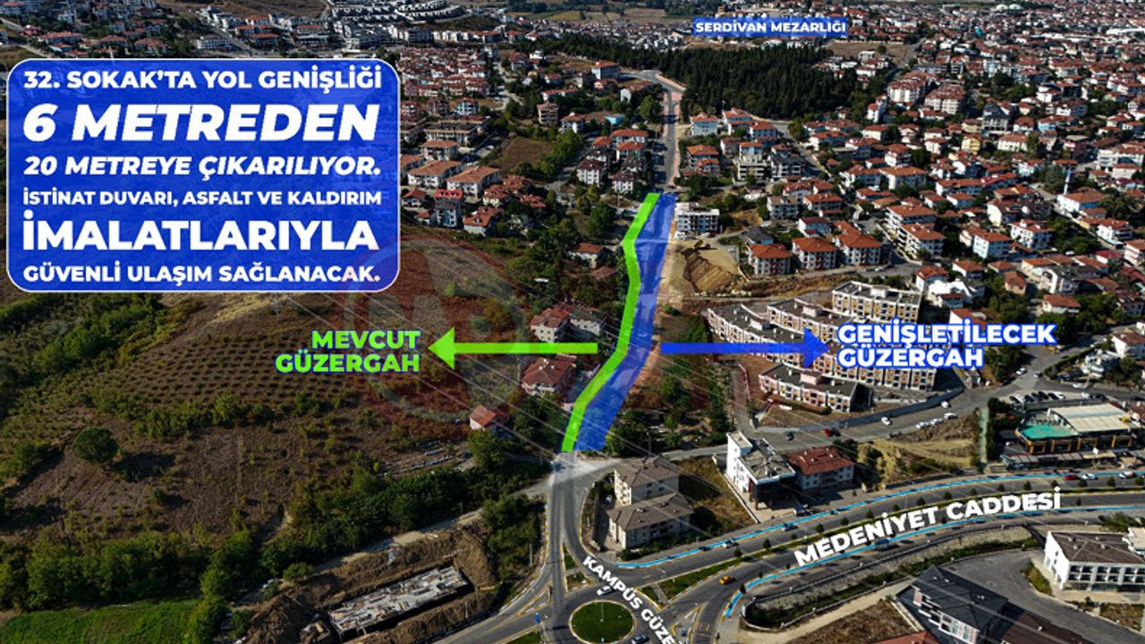 Serdivan Mezarlığı’nın hemen alt kısmından Medeniyet Bulvarı’na bağlanan 32. Sokak’ta yol genişliği 6 metreden 20 metreye çıkarılıyor. Önemli bir geçiş güzergâhı olan ve trafik yükünü kaldırmayan sokak, bir bulvar kapasitesi görecek şekilde yeniden şekillendiriyor. Bölgede ayrıca 4 metre ile 8 metre uzunluğuna sahip iki farklı istinat duvarı inşa edilecek.