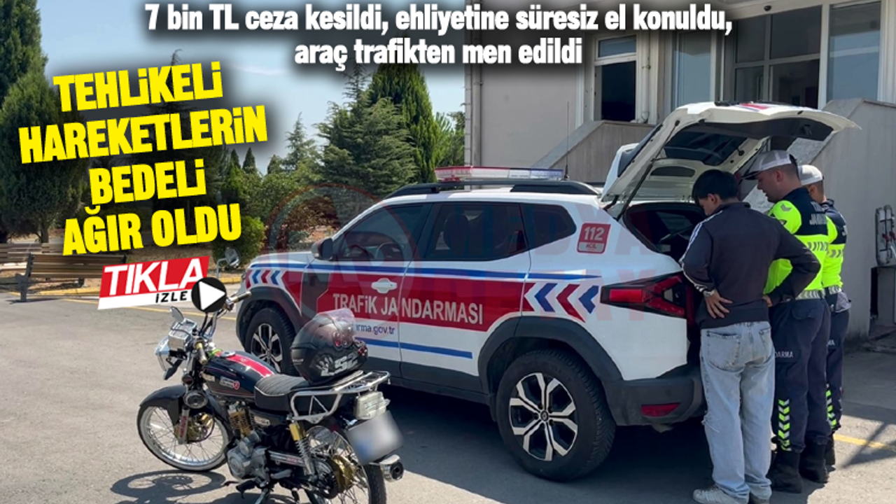 Adapazarı-Karasu karayolunda, 54 ACU 042 plakalı motosikletle seyir halindeyken, aracın üzerine yatan ve uzun süre bu şekilde ilerleyen şahıs, başka bir sürücü tarafından görüntülenmişti. Görüntülerin medyada yayınlanması üzerine harekete geçen jandarma trafik ekipleri, şahsın 18 yaşındaki E.A olduğunu belirleyerek kısa sürede yakaladı. Sürücü hakkında “Trafik Güvenliğini Tehlikeye Sokmak” suçundan adli işlem başlatıldı. İzlenen kamera görüntülerinde açıkça kural ihlalleri yaptığı tespit edilen sürücüye 2918 Sayılı Karayolları Trafik Kanunun ilgili maddelerince 7 Bin 313 TL trafik idari para cezası uygulanırken, sürücü belgesi süresiz iptal edildi. Araç ise trafikten men edilerek yediemin otoparkına çekildi.