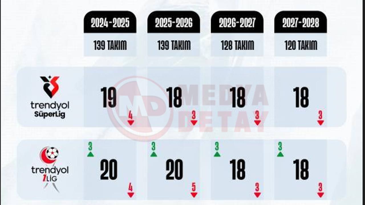 Türkiye Futbol Federasyonu Yönetim Kurulu, 16 Nisan 2025 tarihinde Riva Hasan Doğan Millî Takımlar Kamp ve Eğitim Tesisleri'nde bir toplantı gerçekleştirmiş; toplantıda profesyonel liglerdeki takım sayısının azaltılması kararı aldı. Buna göre profesyonel liglerdeki takım sayıları kademeli olarak 18’de düşürülmesi için planlama yapılırken önümüzdeki sezon 20 takımla oynanacak olan Trendyol 1.Lig’den 5 takım ikinci lige düşürülmesine kararlaştırıldı. TFF’den yapılan açıklamada, “2020-2021 sezonunda 21 takımla oynanan Süper Lig başta olmak üzere, tüm liglerde kademeli olarak takım sayısının düşürülmesi hedeflenmiş; ancak 2023'teki deprem felaketinden etkilenen kulüplerin ligden çekilme talepleri kabul edilmiş ve planlanan sayıya ulaşılamamıştır. Kulüp gelirlerinin artırılması ve daha güçlü bir rekabet ortamı oluşturulması amacıyla, 2025-2026 sezonunda 139 takımın mücadele edeceği profesyonel liglerdeki takım sayısının kademeli olarak azaltılmasına gidilecektir ve hâlihazırda 139 olan profesyonel takım sayısı, aşağıdaki görselde sezonlara göre belirtilen düşme ve çıkma sayılarına göre 120'ye düşürülecektir” denildi.