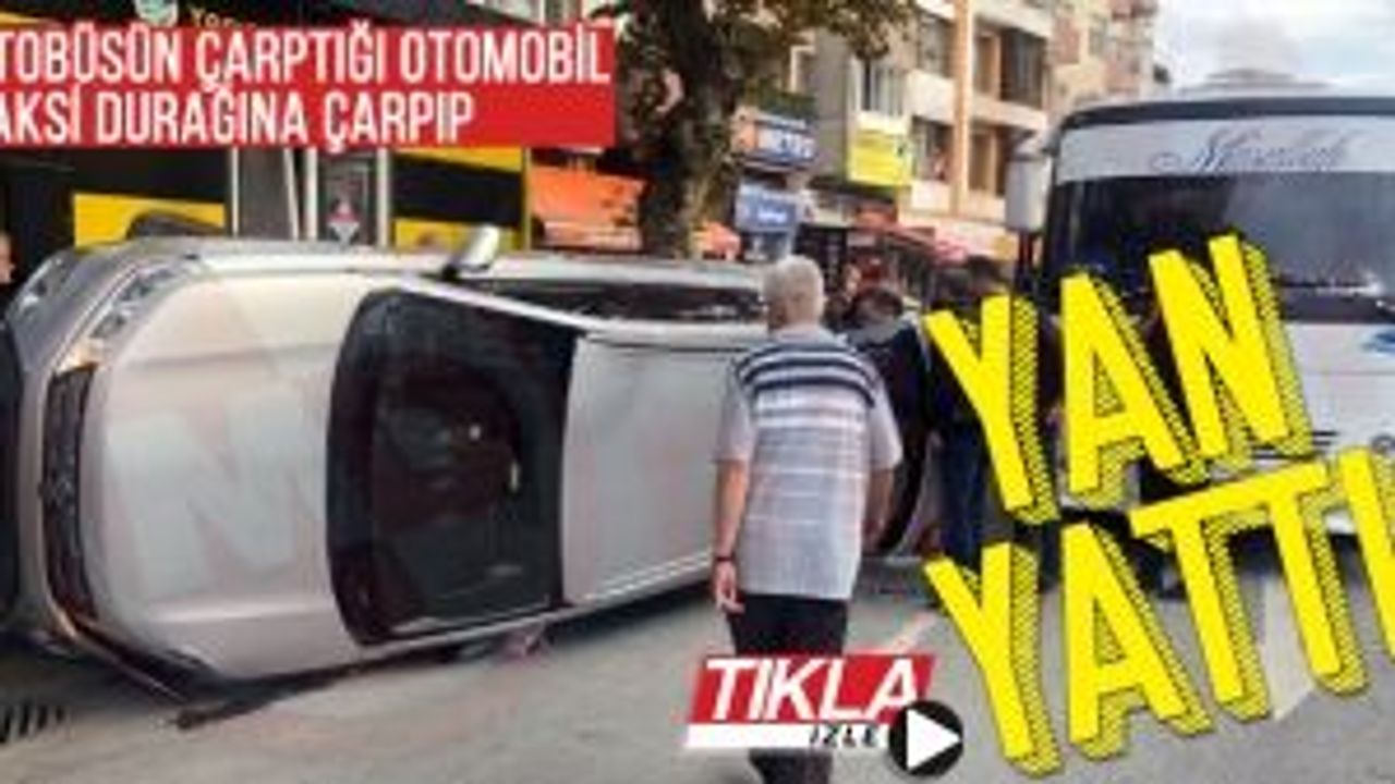 Otobüsün çarptığı otomobil taksi durağına çarpıp yan yattı